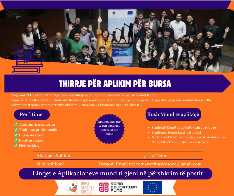 Roma Versitas Kosovo fton studentët Romë të aplikojnë në programin për ngritjen e pjesëmarrjes dhe qasjes në arsimin terciar dhe kalimin në tregun e punës për vitin akademik 2025/2026, i financuar nga REF dhe BE.